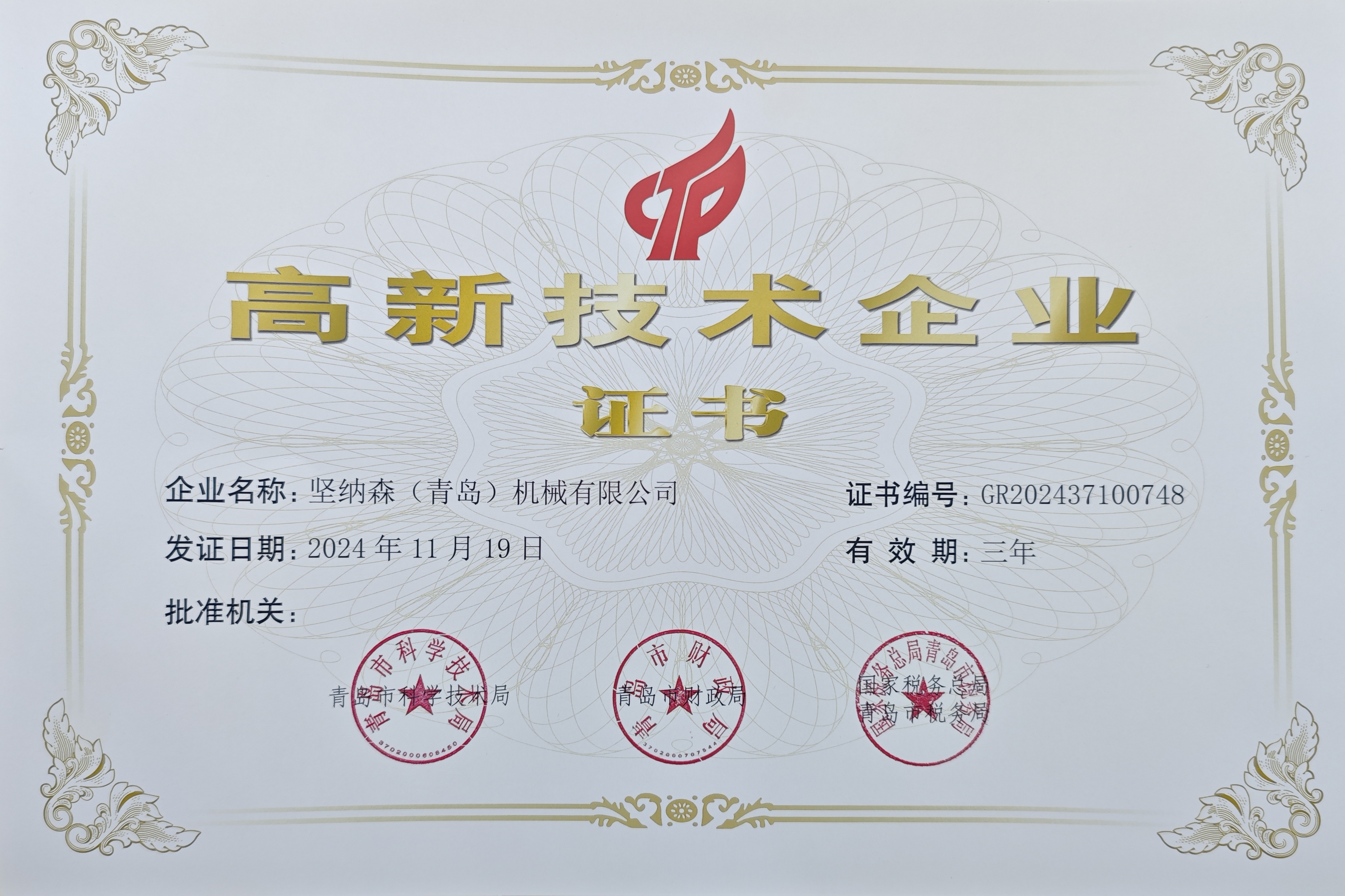 • 熱烈祝賀堅納森(青島)機械有限公司榮獲“高新技術(shù)企業(yè)”再次認(rèn)定!